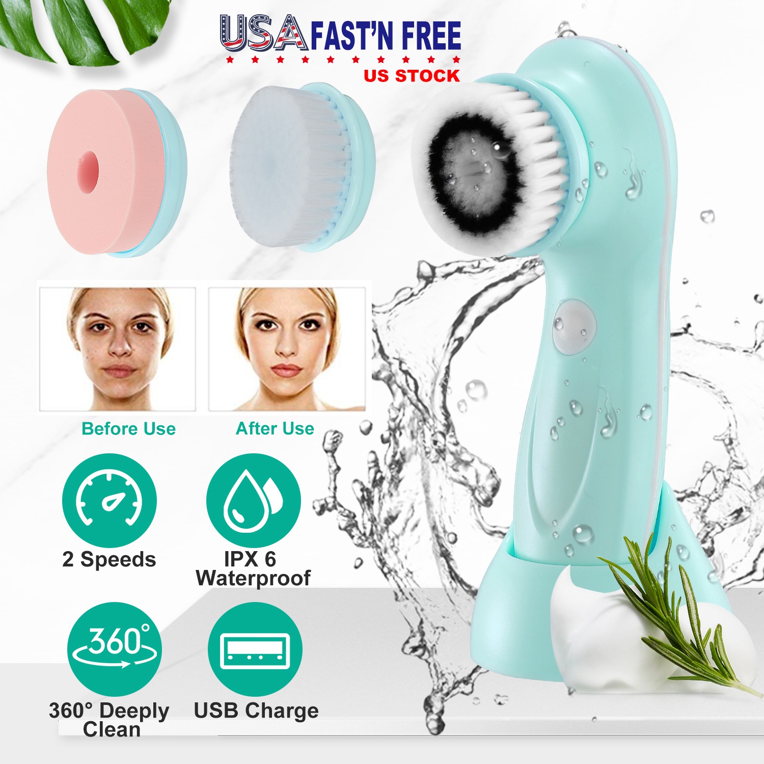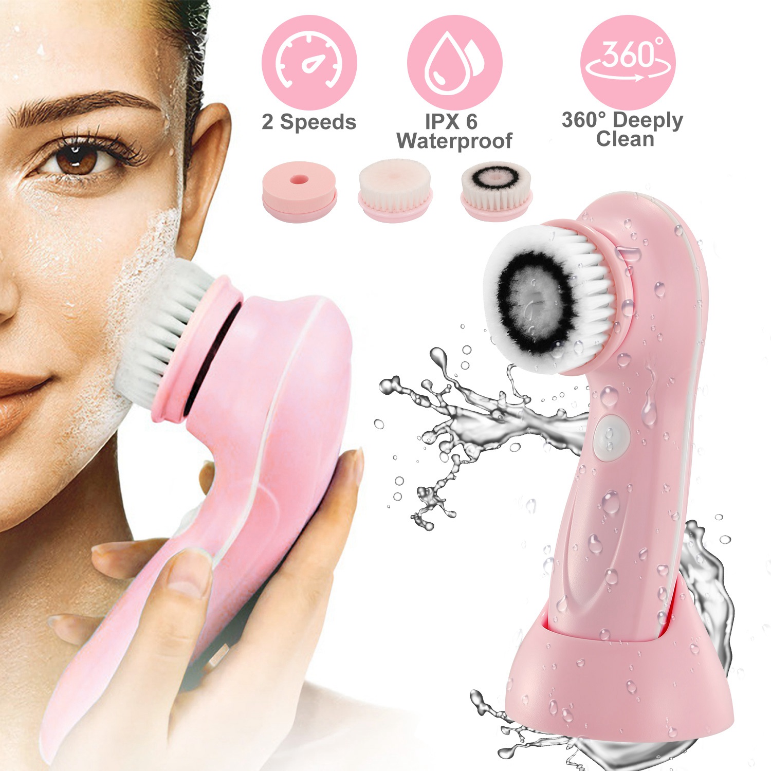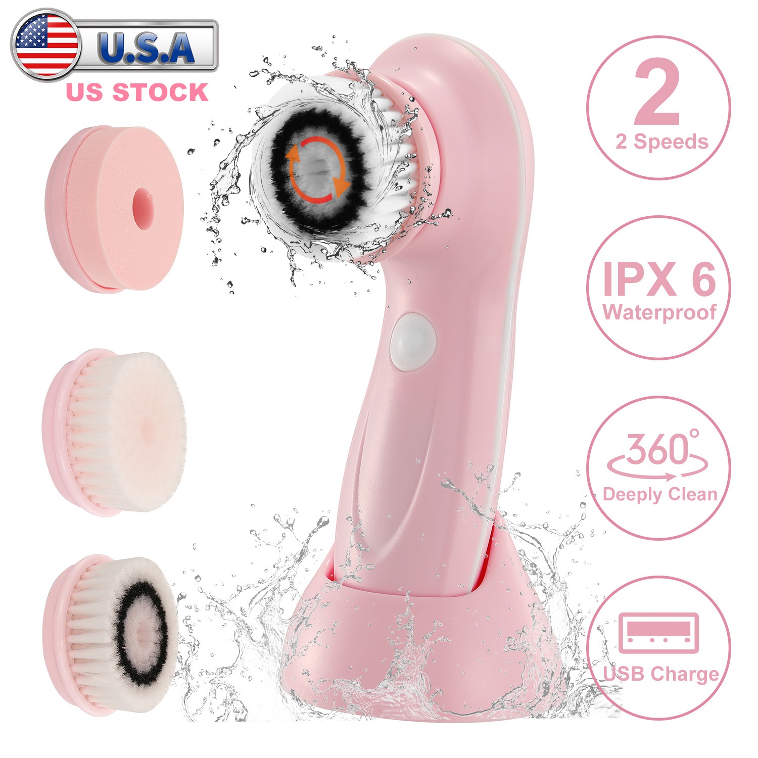 Facial Cleansing Brush IPX6 Waterproof 2 Speeds Face Brush w/3 Brush Heads USB Rechargeable for Deep Cleansing Gentle Exfoliation