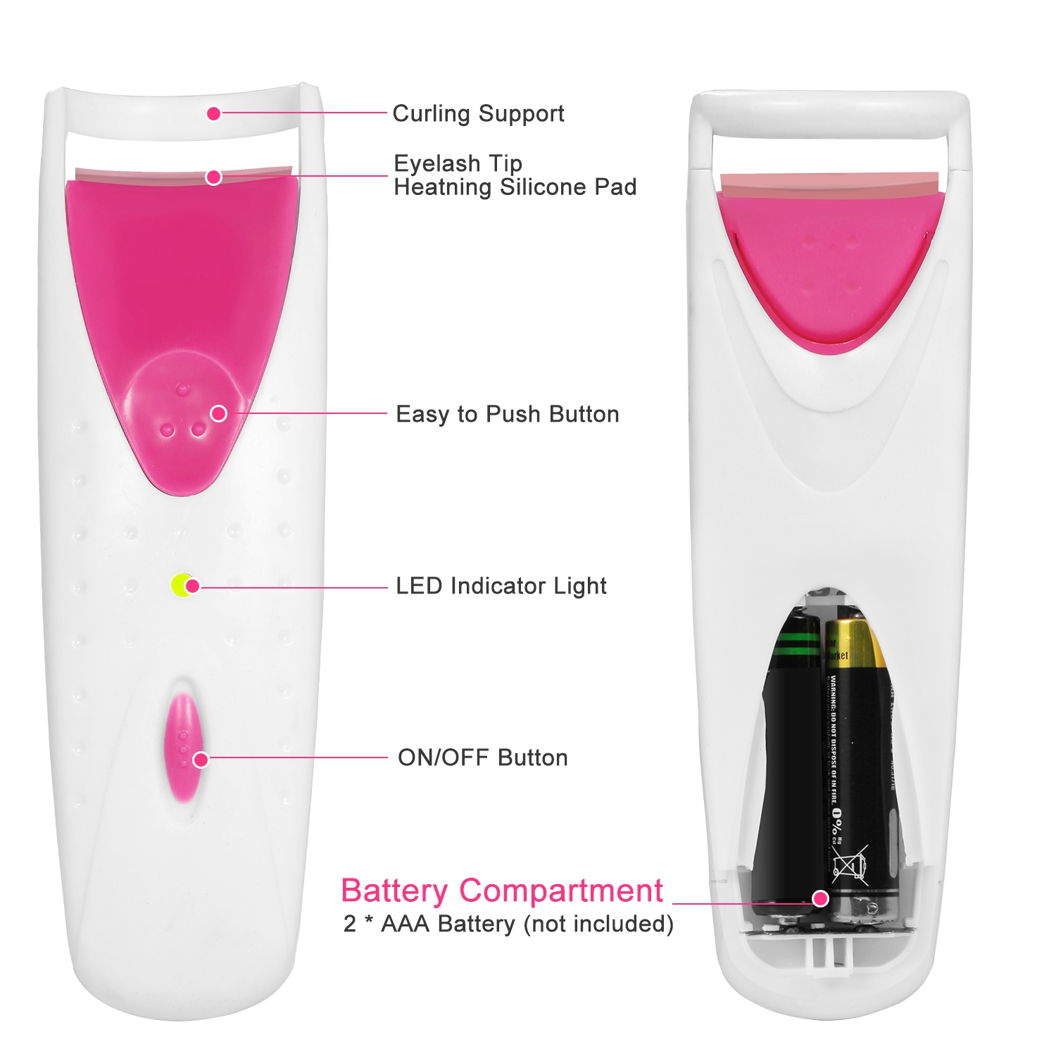 Our electric heated eyelash curler can let you own long-lasting and gorgeous curled eyelashes in seconds. With the moderate heating from the heated eyelash curler and the soft silicone pads can protect your eyelashes from breaking, cutting or damaging. Designed with human eye shape, the curved mouth is just right for your eyes and helps you to create long-lasting, beautiful curls with or without mascara. Moreover, it has a compact portable size and powered by universal 2 * AAA battery (not included), easily fits into your cosmetic bag, handbag, easy to carry.