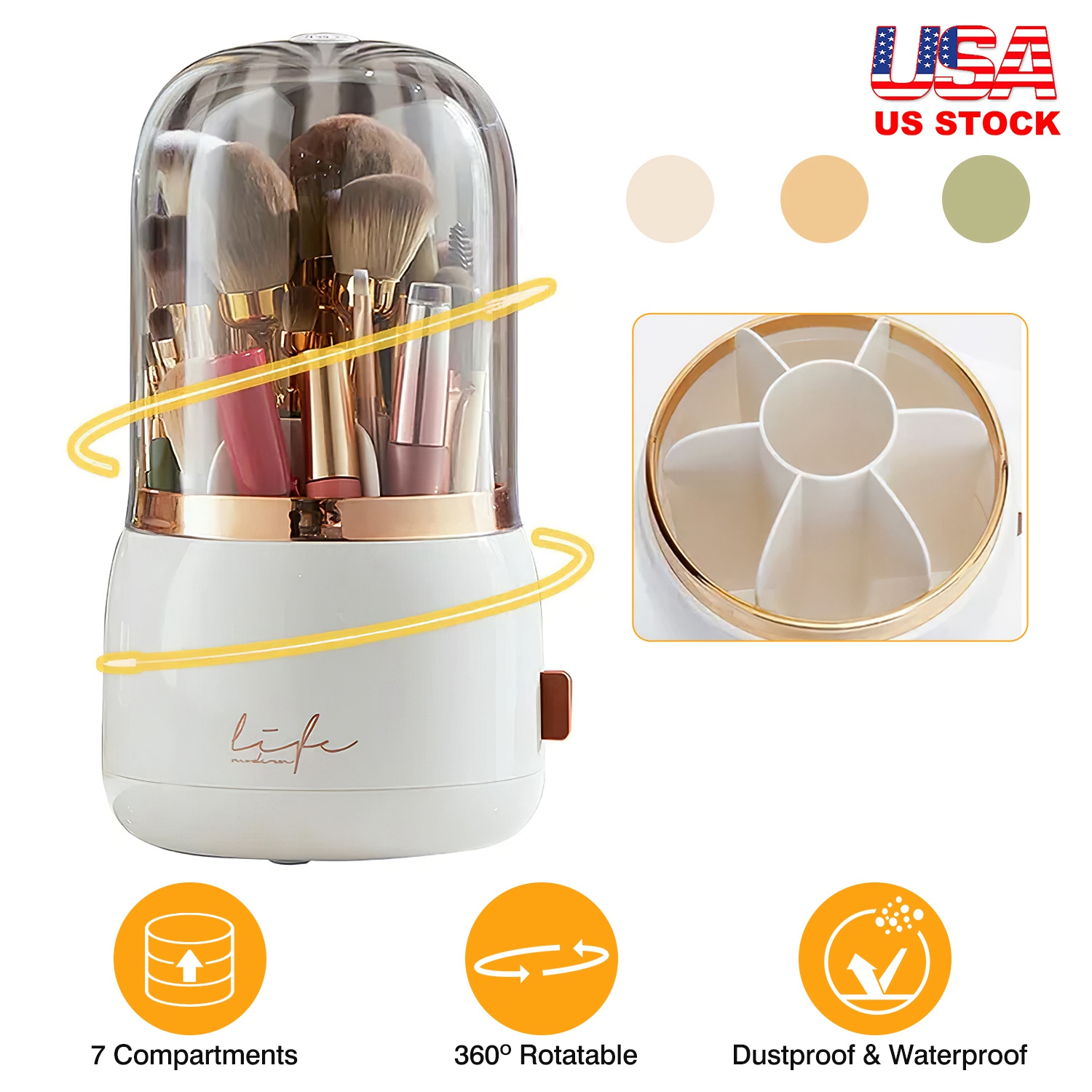 Home > 360° Rotating Makeup Brush Holder with Lid Makeup Organizer for Vanity Dustproof Makeup Brush Container with 7 Compartments