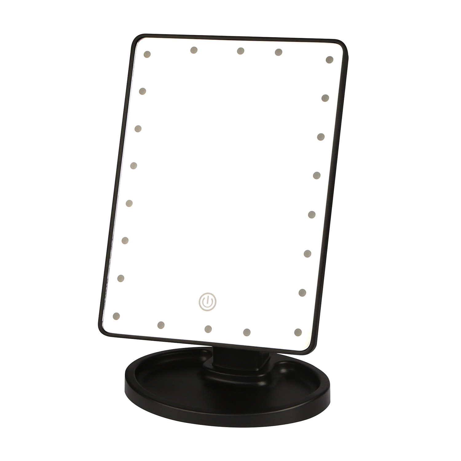 This large cosmetic mirror with 22 bright LEDs allow you to pluck eye brows or put on your make-up in the dark or poorly lit areas. You can put it on your desk and adjust the mirror to your desired positions. The touch screen is nice for you to turn on/off the LED spotlights and adjust the brightness to your preference. Soft bright lights can be operated by USB charging cable (included) or 4pc AA batteries (not included).