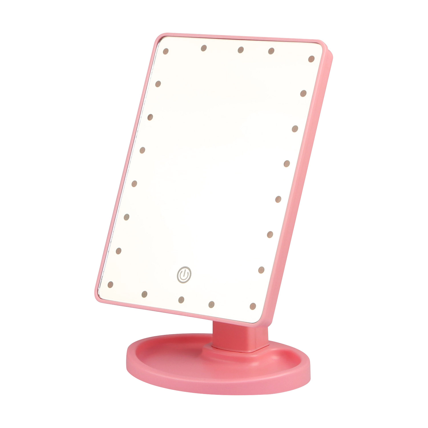 This large cosmetic mirror with 22 bright LEDs allow you to pluck eye brows or put on your make-up in the dark or poorly lit areas. You can put it on your desk and adjust the mirror to your desired positions. The touch screen is nice for you to turn on/off the LED spotlights and adjust the brightness to your preference. Soft bright lights can be operated by USB charging cable (included) or 4pc AA batteries (not included).