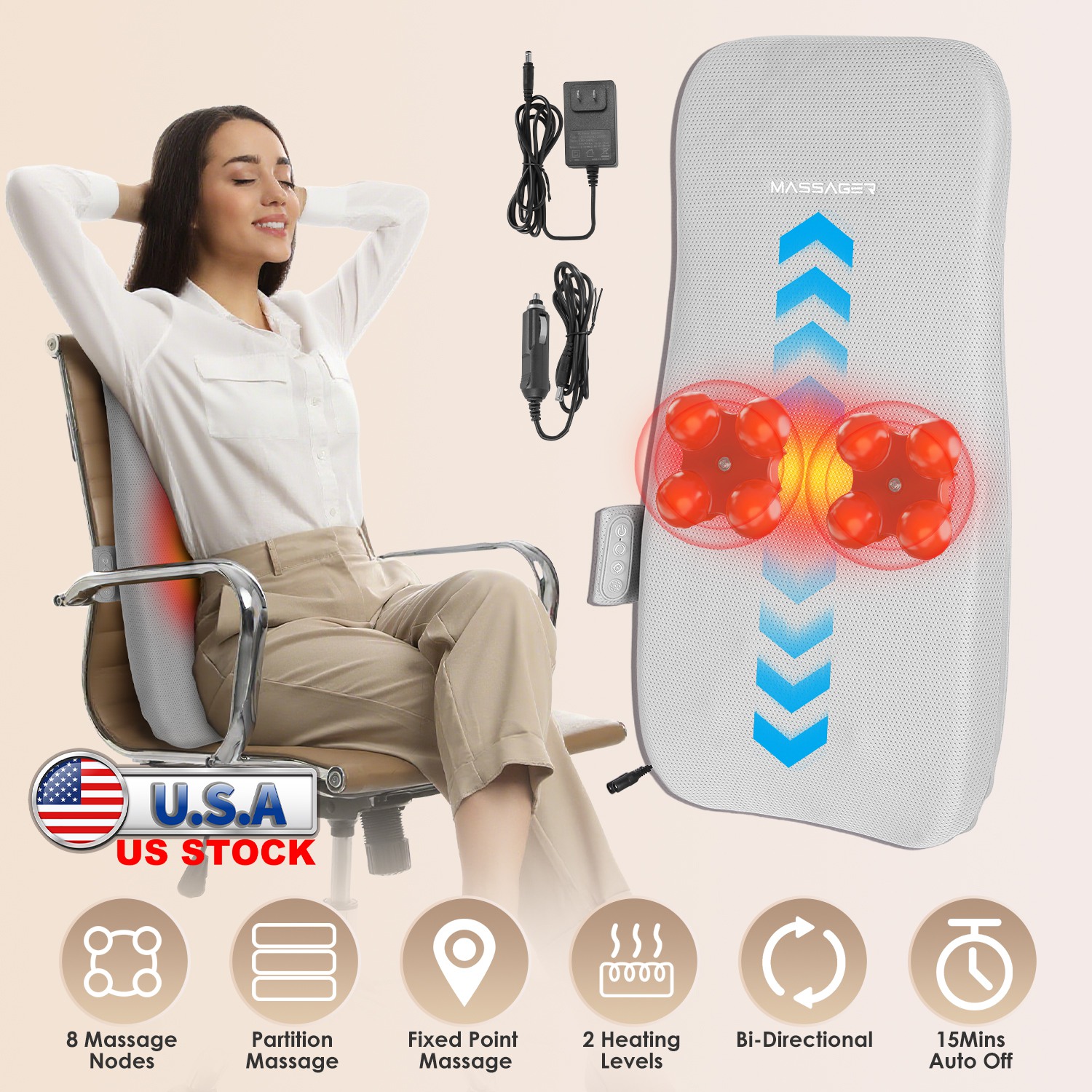 This back massager features with 8 rotating kneading nodes that glide smoothly along the spine for full-back coverage, stimulating professional hand massage to deliver deep yet gentle pressure to loosen tight muscles and improve circulation. With targeted partition massage modes, you can customize sessions for the full/upper/lower back, focusing relief where needed most. 2-Level soothing heat enhances relaxation by easing stiffness and tension. Designed for safe and easy use, it includes 15minute auto shut-off and simple button controls. Ideal for office workers, athletes, or anyone seeking daily relaxation, this full back massager is a thoughtful gift for loved ones.