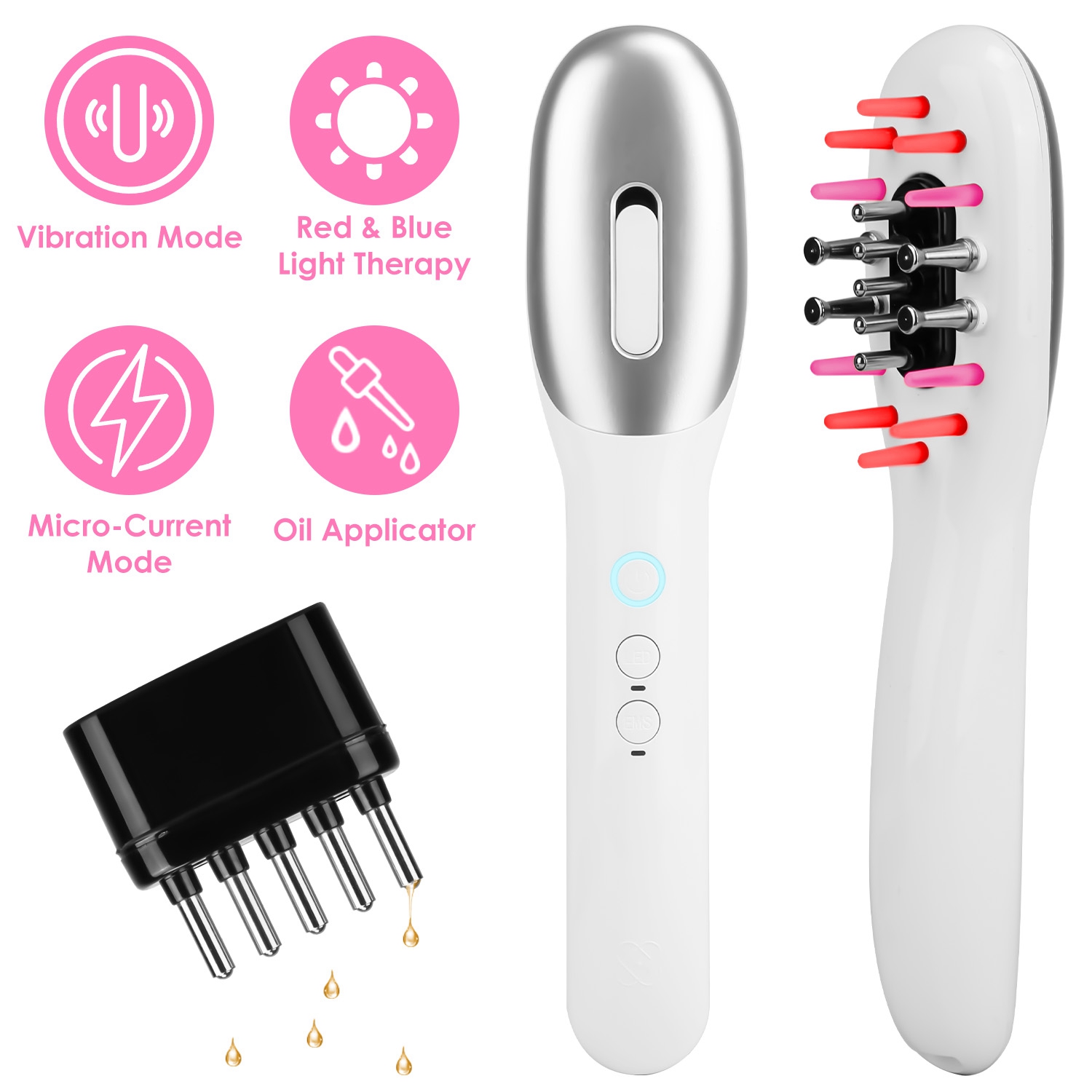 Equipped with vibration massage mode, blue&red light therapy, micro-current mode and oil applicator function, this multifunctional massage comb with total 19Pcs massage heads, is great to promote blood circulation, help wake up the scalp, reduce headache, relieve you of a day's fatigue and improve your sleep. An ideal gift for your partner, parents and friends.