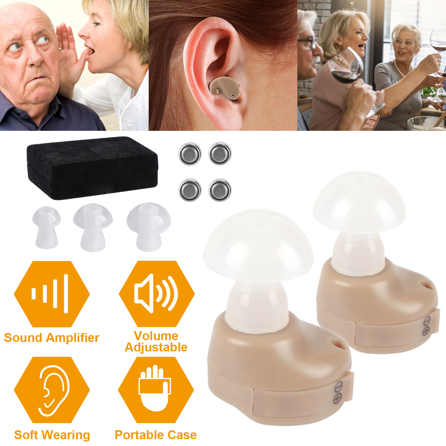 Help you to hear every day sounds like the doorbell, the telephone ringing and the kettle boiling. We should also help you to follow what people are saying, so that conversation becomes much easier and more relaxed. Volume control allows the user to comfortably modify volume and tone for optimum hearing. Advanced digital micro process technology offers clearer and louder sound for you. S/M/L ear plugs, fit your auricle canal seamlessly and safe for your ears. Carry case can be carried to anywhere you want. Convenient for watching movie, enjoying drama, attending meeting, or having class, etc..