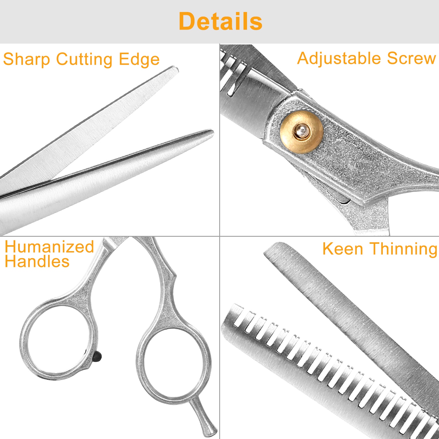 Our 2 pcs hair cutting scissors set including a straight scissors and a hair thinning scissors, which are made of premium-quality stainless steel, abrasion-resistant, rustproof and durable. Our hair cutting scissors give a clean cut, which is great for trimming bangs or wigs. The hair thinning shears has 22 teeth on one side, giving your hair a suitable thinning rate, which is perfect for men/women to add layers, thin out thick hair or wigs and texturize hair for stylish looks. The PU leather case organize the scissors set properly and provide extra protection by preserving scissors and preventing accidents, also, makes it more portable. This hair cutting scissors set is a great choice for both professional hairdressers (barber shop or salon workers) and home users, widely used for hair trimming to children, men, women or the elderly.