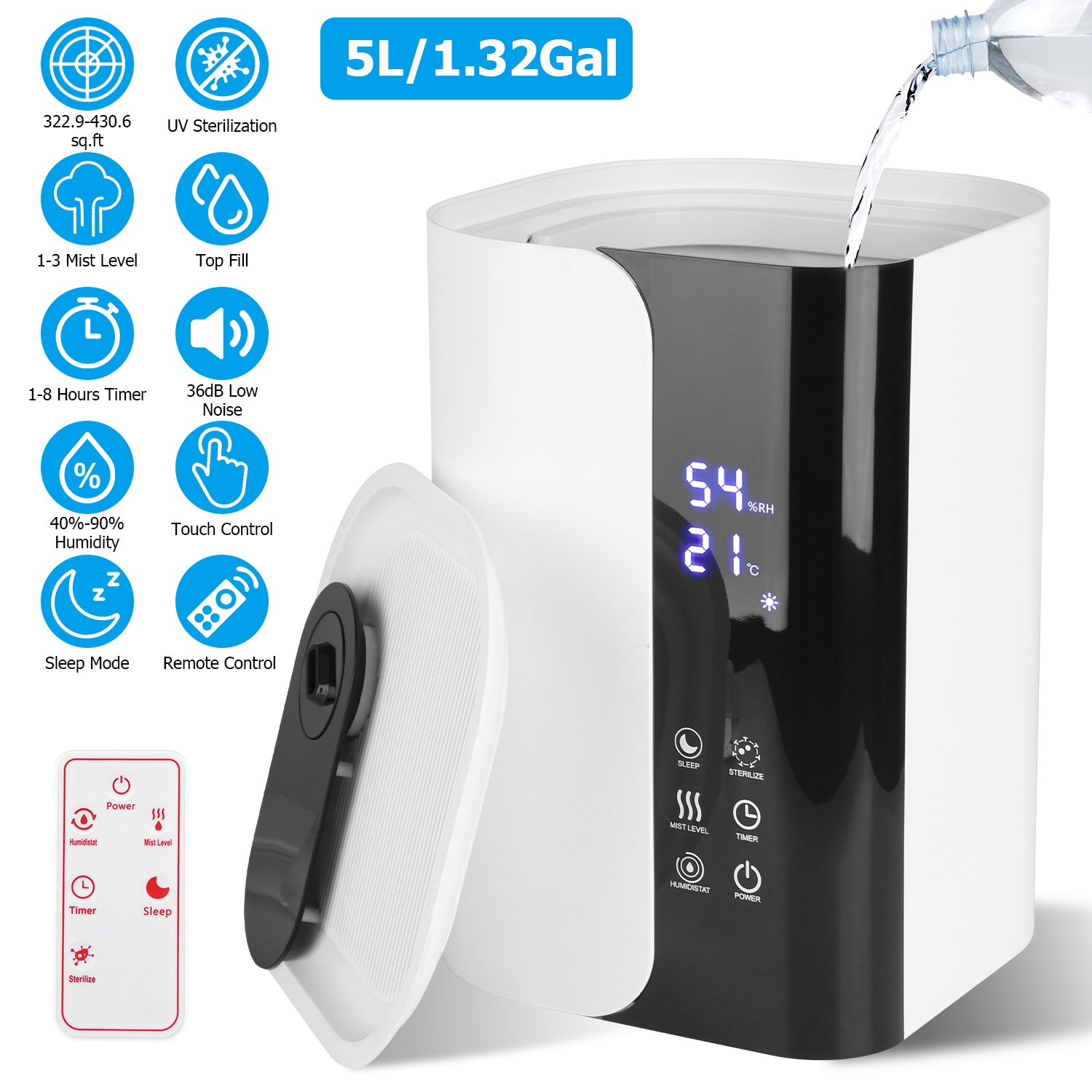 5L/1.32Gal Humidifiers Top Fill Cool Mist Humidifier with Essential Oils Diffuser Filter 360° Rotatable Outlet Nozzle 1-8 Hours Timer 1-3 Level Mist 4