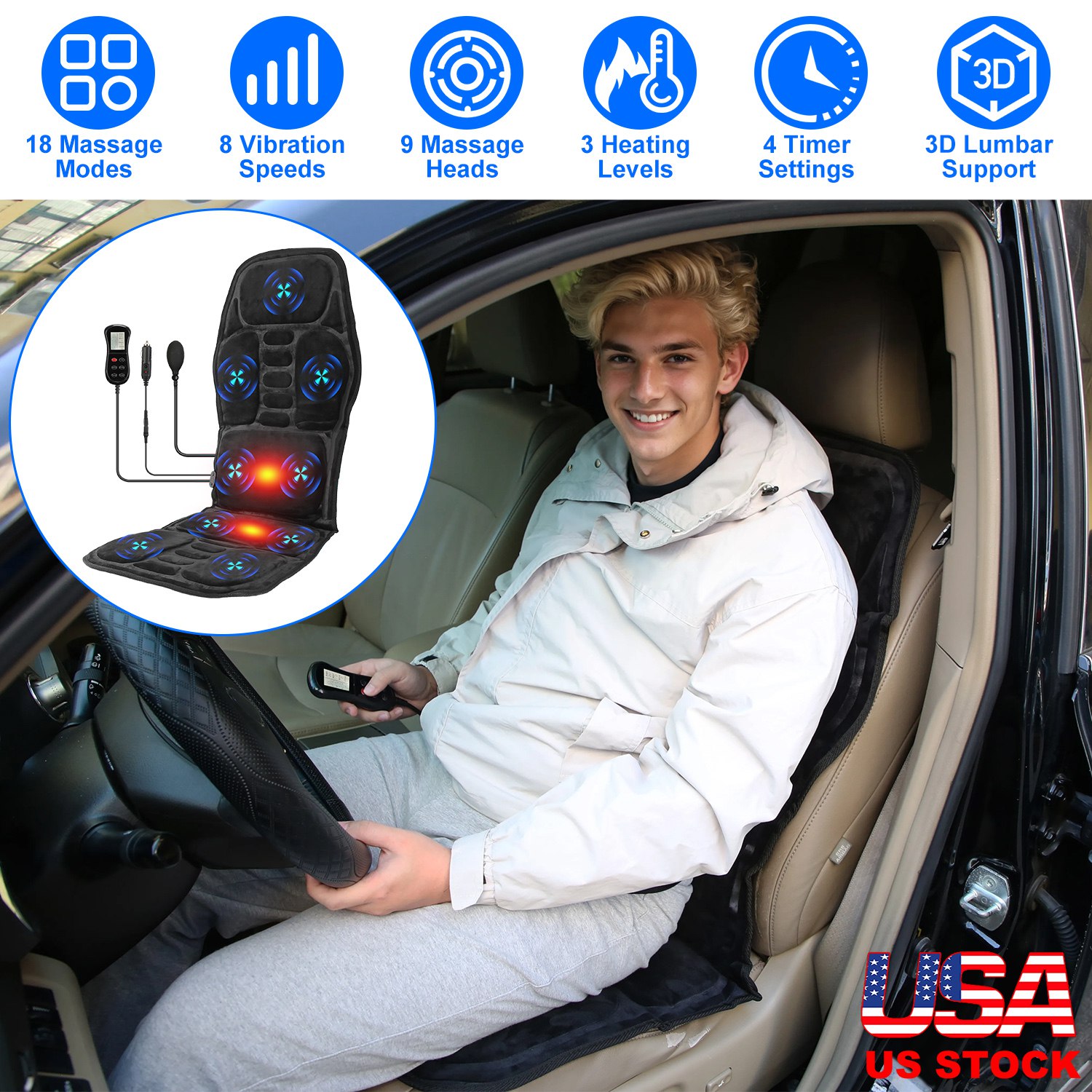 Designed with 18 massage modes, 4 pinpoint massage modes, 8 vibration speeds and 3 heating levels, our massage chair pad offers customizable relaxation for the neck, back, waist, hip and thigh. The adjustable 3D lumbar traction design not only provides strong support and stabilization for the lower back, but also helps maintain proper posture and the natural curve of your spine. With the included adapter cable and the cigarette cable, you can use it at home, in the office and car. Support over-current protection. Enjoy a safe and comfortable massage after a busy day. A thoughtful gift for your mother, father, lovers and colleagues!