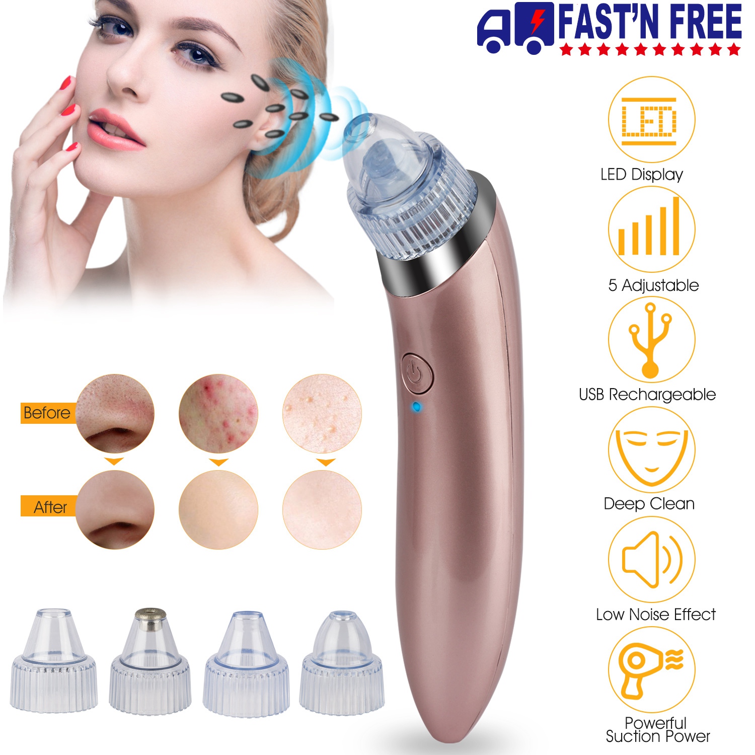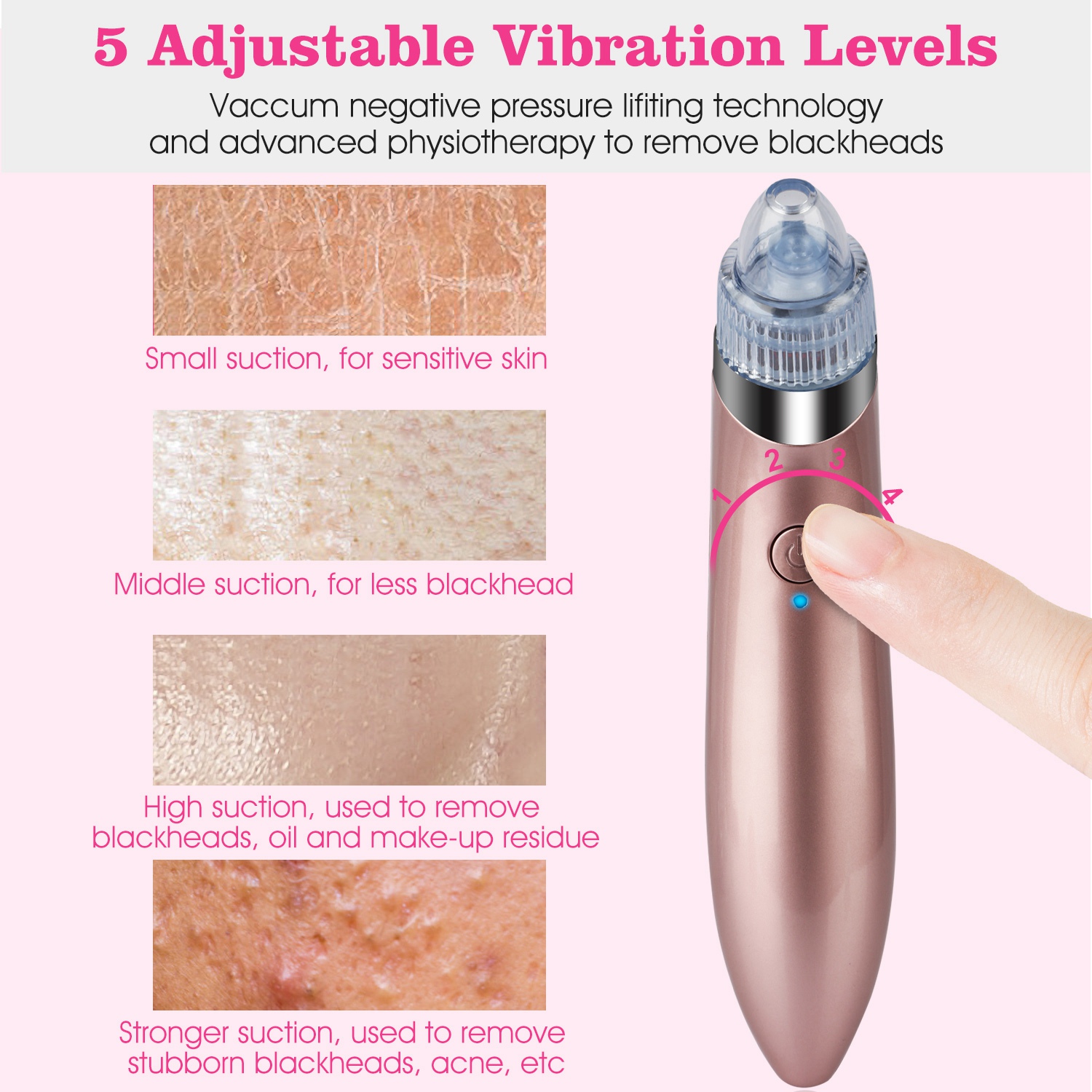 Use this easy to handle skin care vacuum device to enjoy fast and convenient pore cleansing, acne, blackheads & whiteheads removal and wrinkles treatment from the comfort of your home with much less cost than spent in beauty shops/salons. One key operation, touch button with 5 intensity levels. Level 1: Small suction, for sensitive skin; Level 2: Middle suction, for less blackhead; Level 3: High suction, used to remove blackheads, oil and make-up residue; Level 4-5: Stronger suction, used to remove stubborn blackheads, acne, etc, you can choose the suitable intensity level. Interchangeable different purpose probes with adjustable intensity shifts enable custom skin treatment for a more satisfying result.