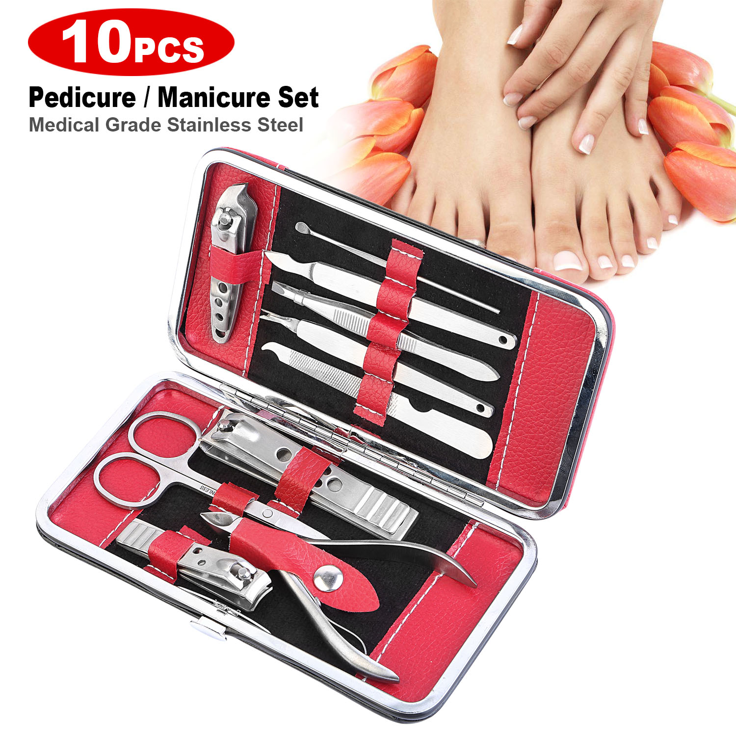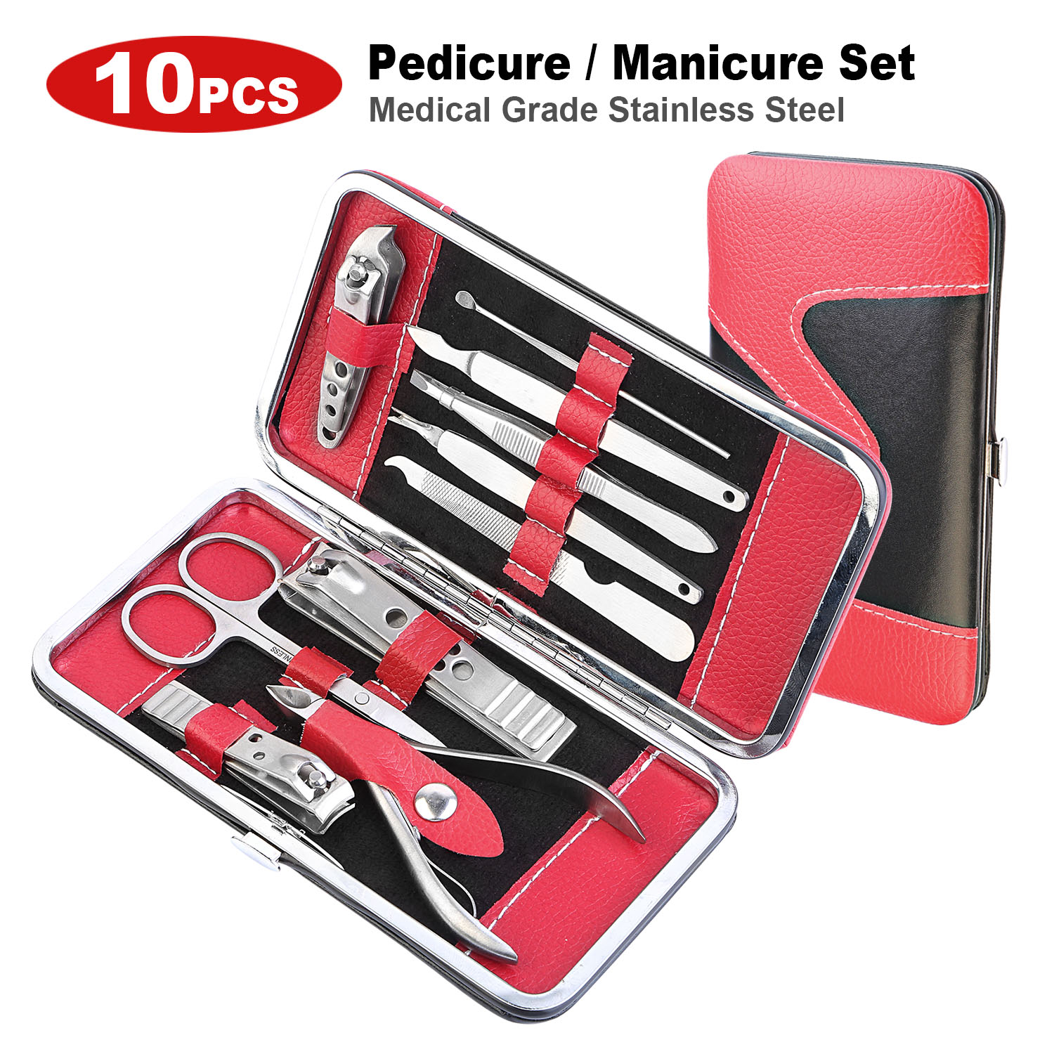 The 10-in-1 10Pcs pedicure / manicure set comes with a portable durable PU leather case for easy carrying when traveling. There is an organized compartment inside the case for each of the 10 tools so that they are held in securely and can be used conveniently. The tools are all made from stainless steel and so easy to keep clean and hygienic when need be and also very durable.