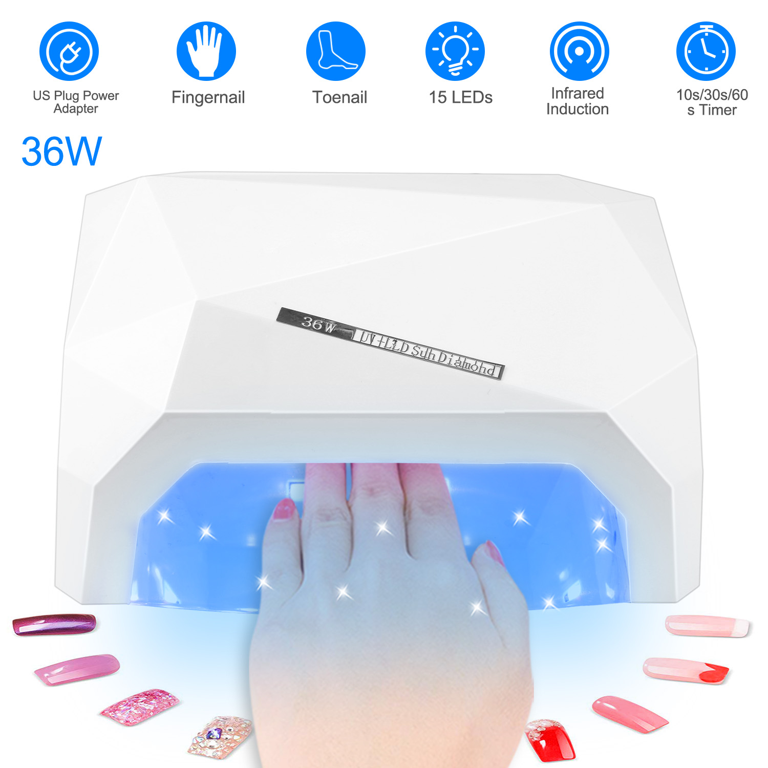 Our 36W UV LED Lamp is specially designed for fingernail toenail gel curing, which has 3 Kinds of Time Setting, 10s, 30s or 60s no pain mode, meeting your different demands for curing time. Double light source from 15 high-performance LED lights, 180° illumination, LED light distributes evenly, curing nail gels (includes UV gel / Builder / LED gel) more quickly, no harm to your eyes and your skin. Why not try it now?