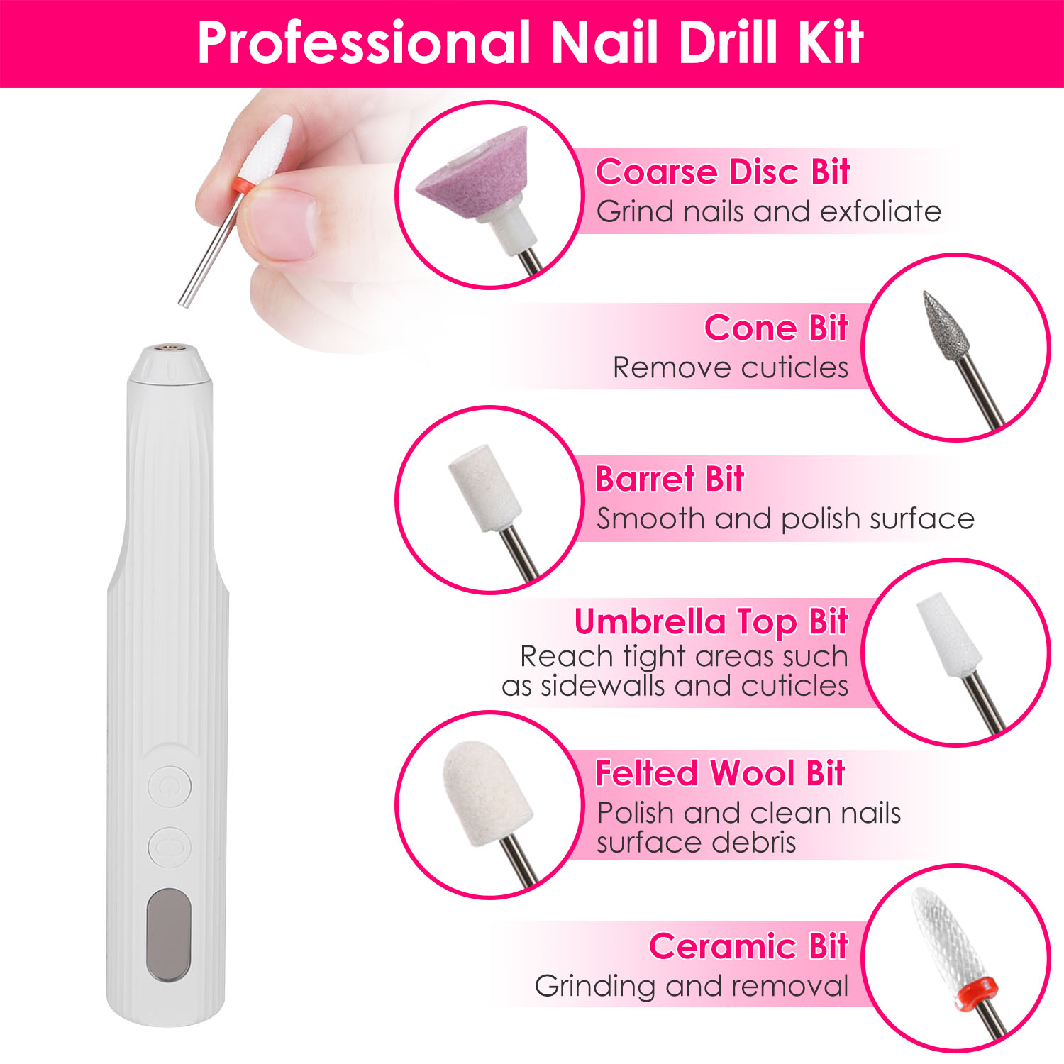 Our all-in-one professional nail drill kit includes 6 kinds of drill bits, which is suitable for grinding, carving, cutting, polishing for all nail arts as well as cuticle removal. With 5 adjustable speeds and F/R direction control, our electric nail drill enables precise and efficient nail artistry for both right-handed or left-handed user. Moreover, the charging base not only can recharge the electric nail drill, but also can be used as a drill bit storage case and UV nail dryer with timer setting. Functional, versatile and easy-to-use, it's an essential tool for nail-care professional person or beginners alike.