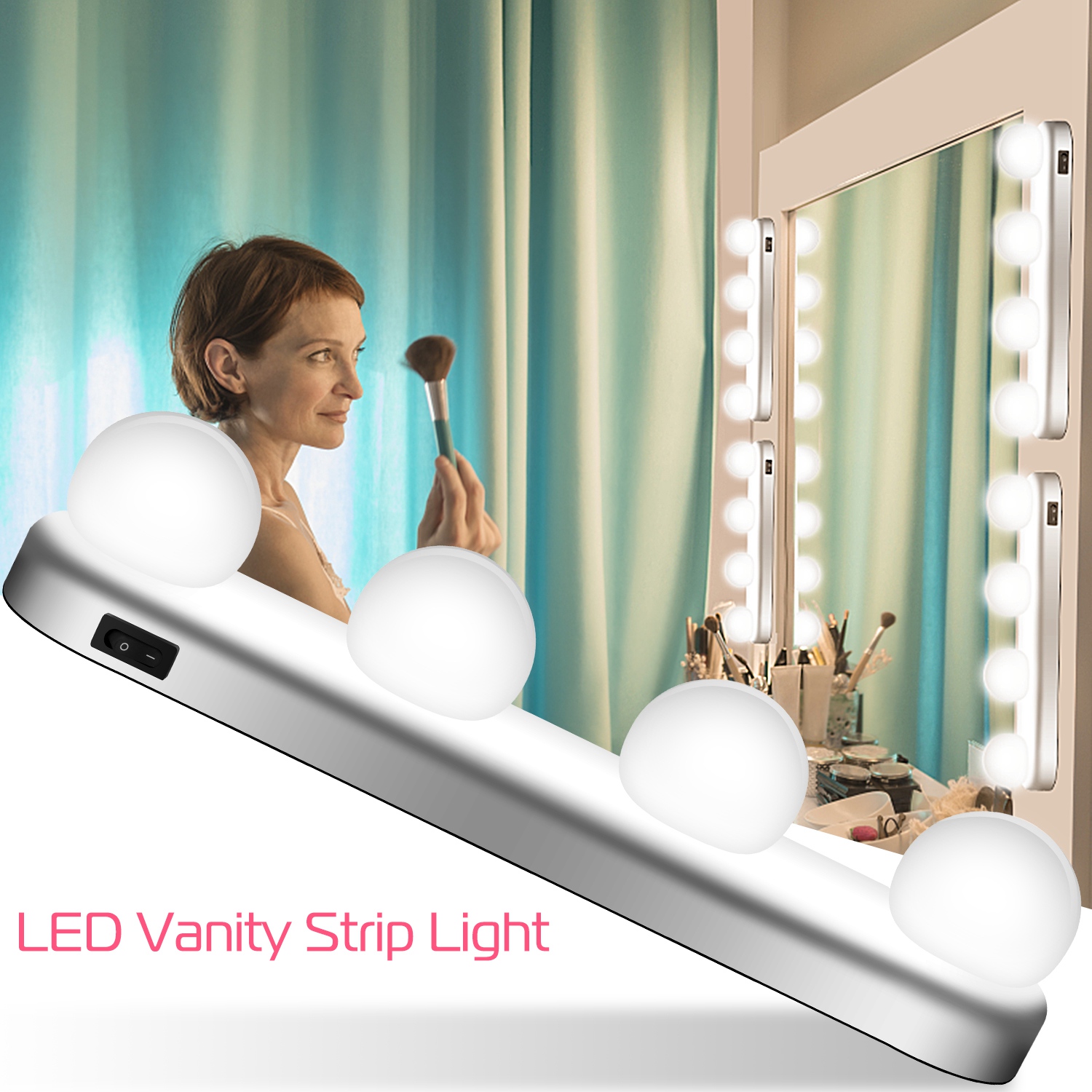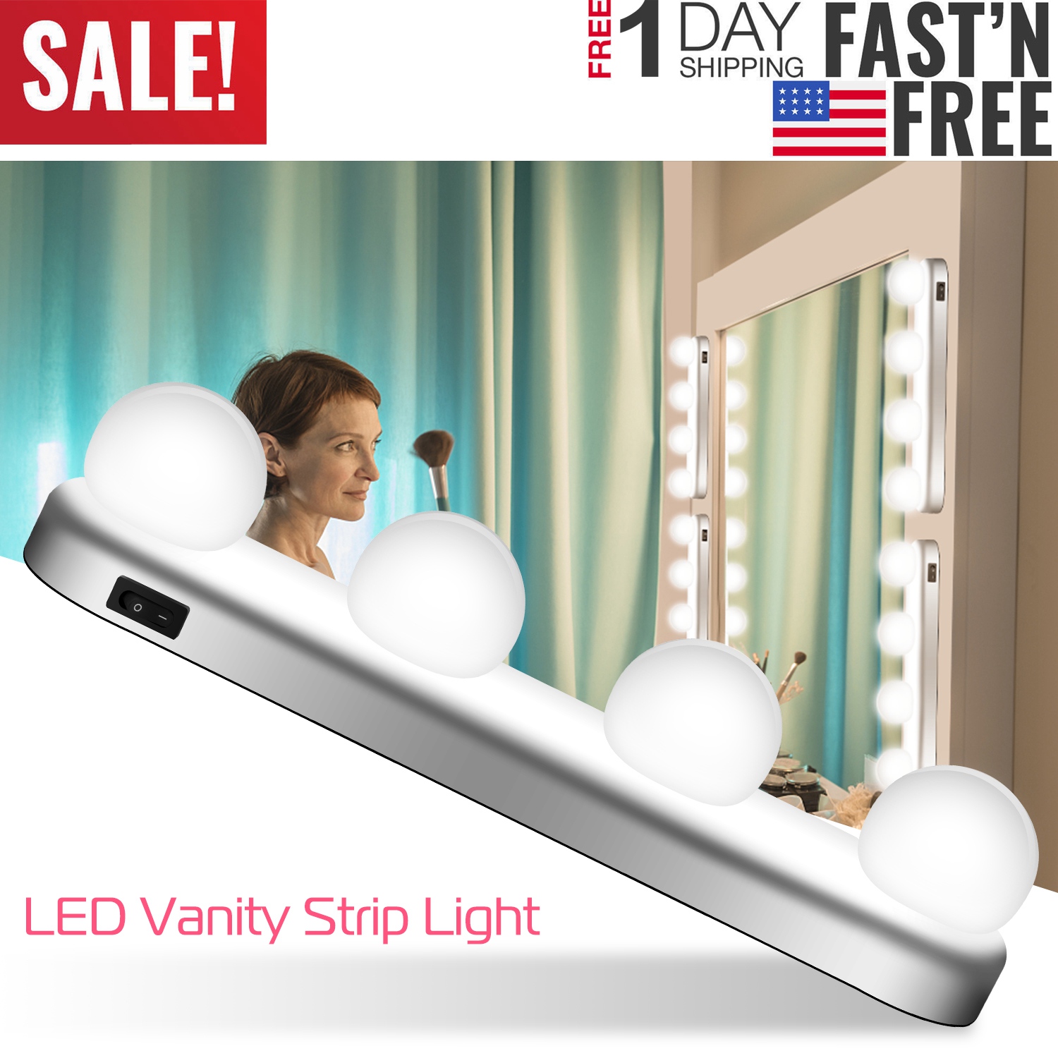 Does the insufficient light distress you when you makeup? Our LED vanity strip light is perfect solution for you to light up your face and show the most natural makeup in the mirror. Comes with 24LED beads with 4 spheriform lampshade with High light transmittance to give off soft daylight white lighting effect. Powered by 4 * AA batteries without messy cord to keep your dressing table tidy. With two suction cups and two screw holes, easy to fit on the mirror, mirror frame or wall.