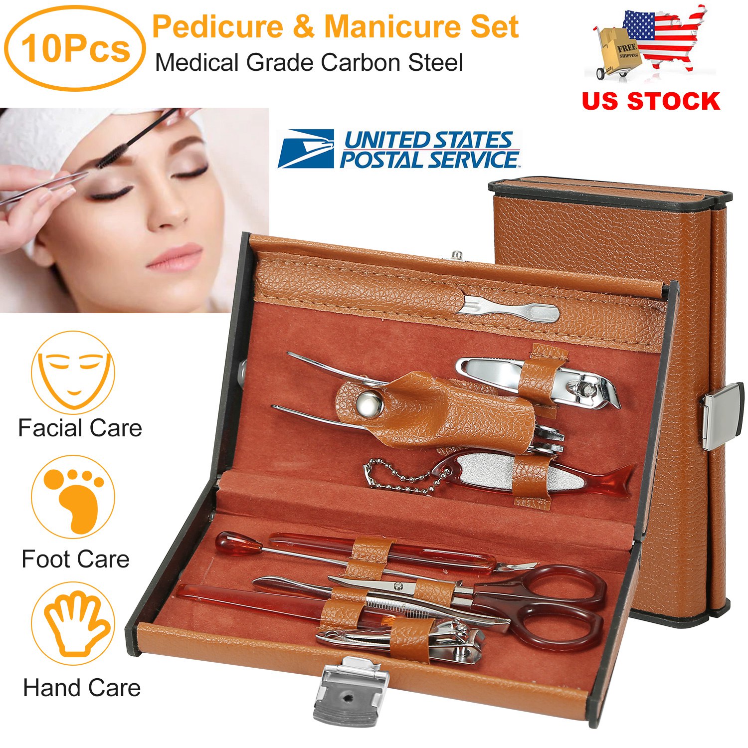 10Pcs Pedicure / Manicure Set Nail Clippers Stainless Steel Cuticle Remover Grooming Kit with Leather Case