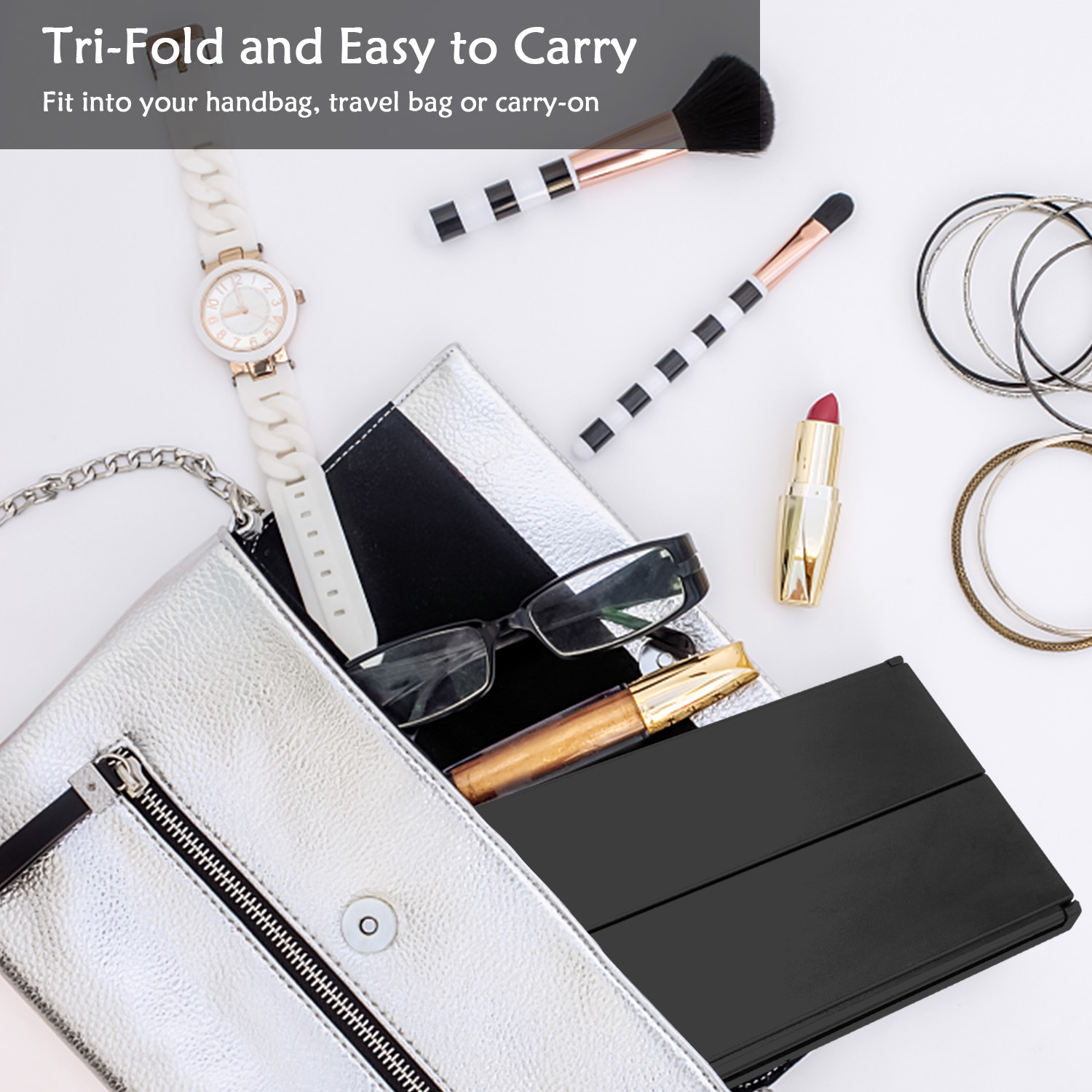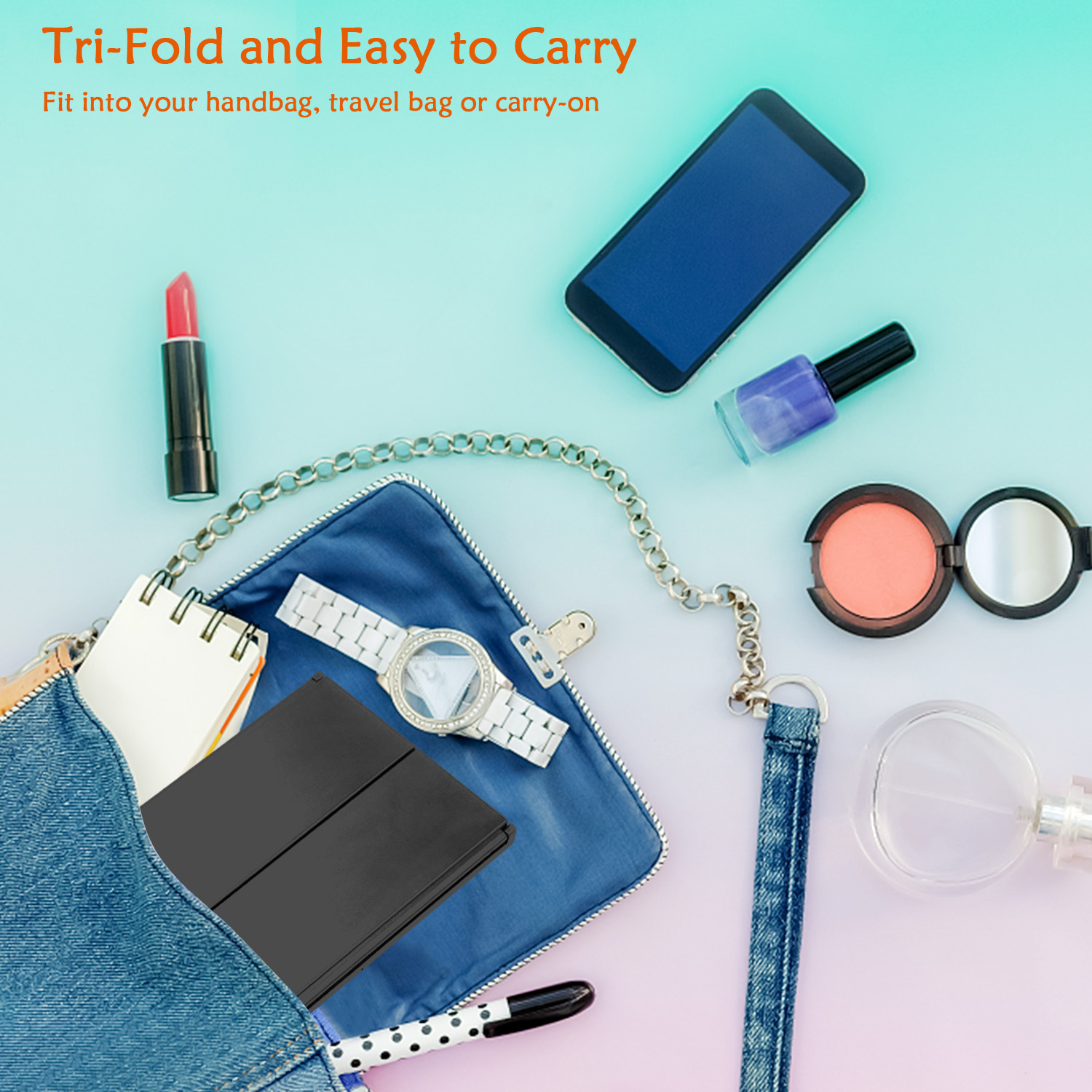 The trifold makeup mirror features 8 LED lights and foldable design to offer crystal clear mirror surface, showing the most natural makeup in the mirror even in the dark condition. With a 90° adjustable back stand, you can adjust the mirror angle up to your desired angle and place it on your vanity, countertop, desk or any flat area stably. Its compact and lightweight design makes it easy to carry and fit into your handbag, travel bag or carry-on.