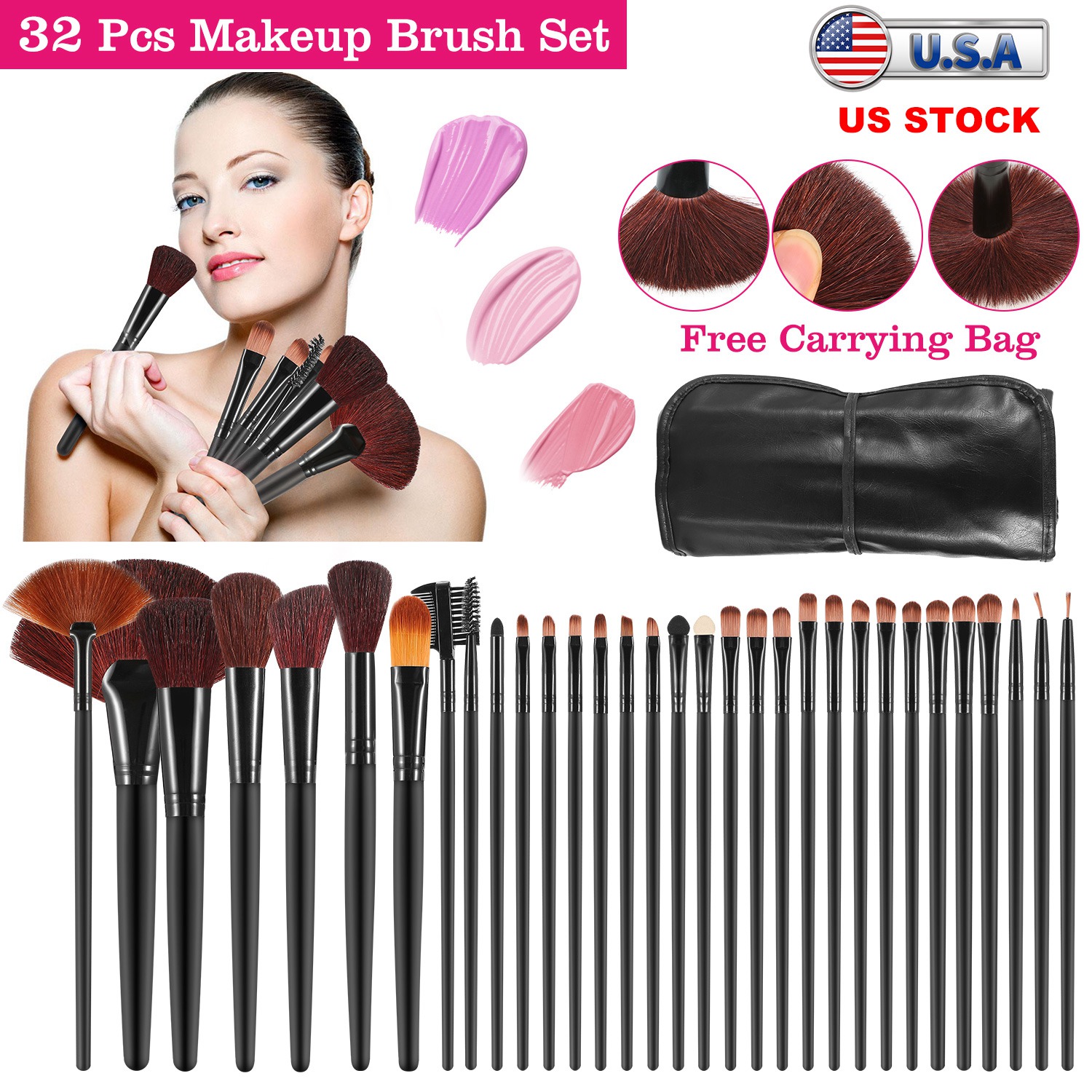 32Pcs Makeup Brush Set Prof Cosmetic Brushes Foundation Concealers Eyeshadow Brush Tool Kit w/ PU Leather Bag